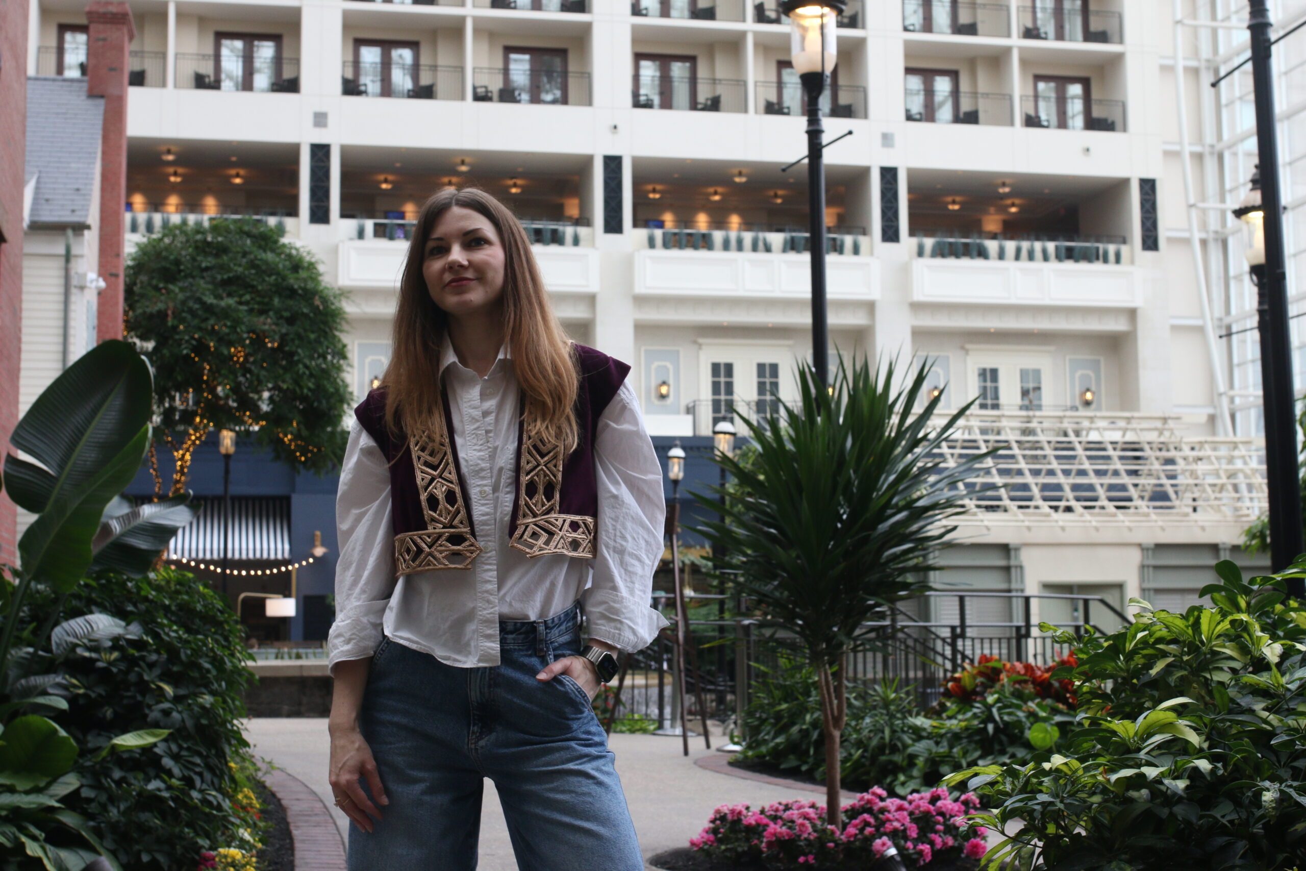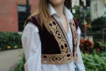 The piece is adorned with golden handmade embroidery, created in collaboration with artisans from around the world who share a commitment to preserving traditional craftsmanship. Each thread is meticulously hand-stitched, transforming cultural memory into wearable art.